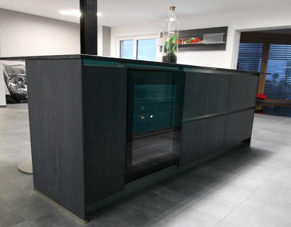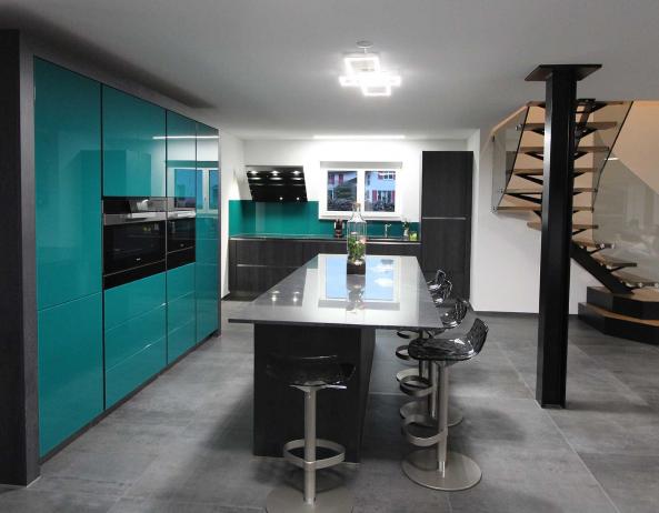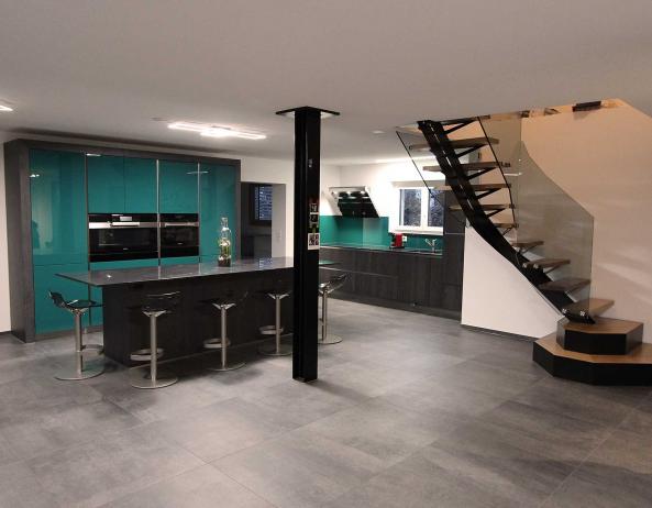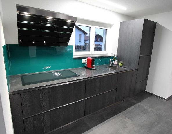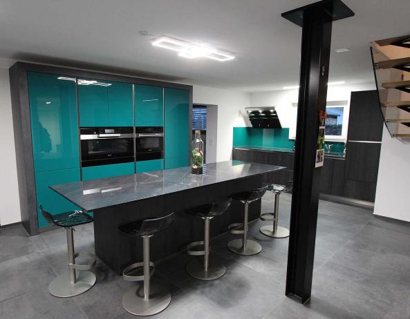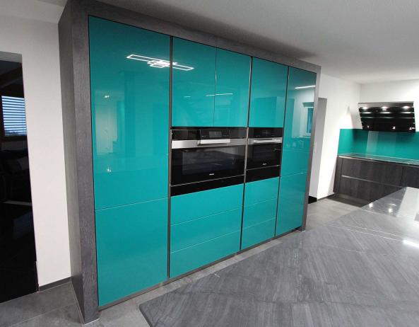 Cette cuisine ultra moderne s'accorde grâce à un mélange de bois foncé et de verre colori vert opal. Les électroménagers en verre noir avec une touche d'inox apporte encore un peu plus de modernité à ce projet.